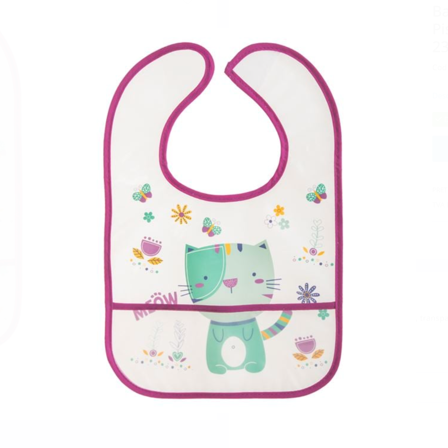 Bavetică transparentă cu buzunar colector, decorată cu pisicuță verde mentă și margine fucsia, dimensiune 23x35 cm.