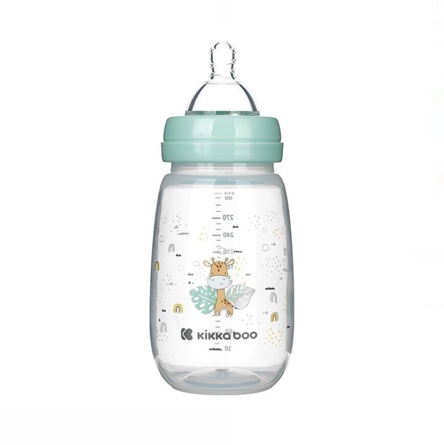 Biberon din plastic (0% BPA) cu tetină din silicon anti-colici, flux mic, gât larg, capacitate 310 ml, de culoare verde menta și model girafă Kikka Boo. Ideal pentru hrănirea bebelușilor în siguranță și confort.