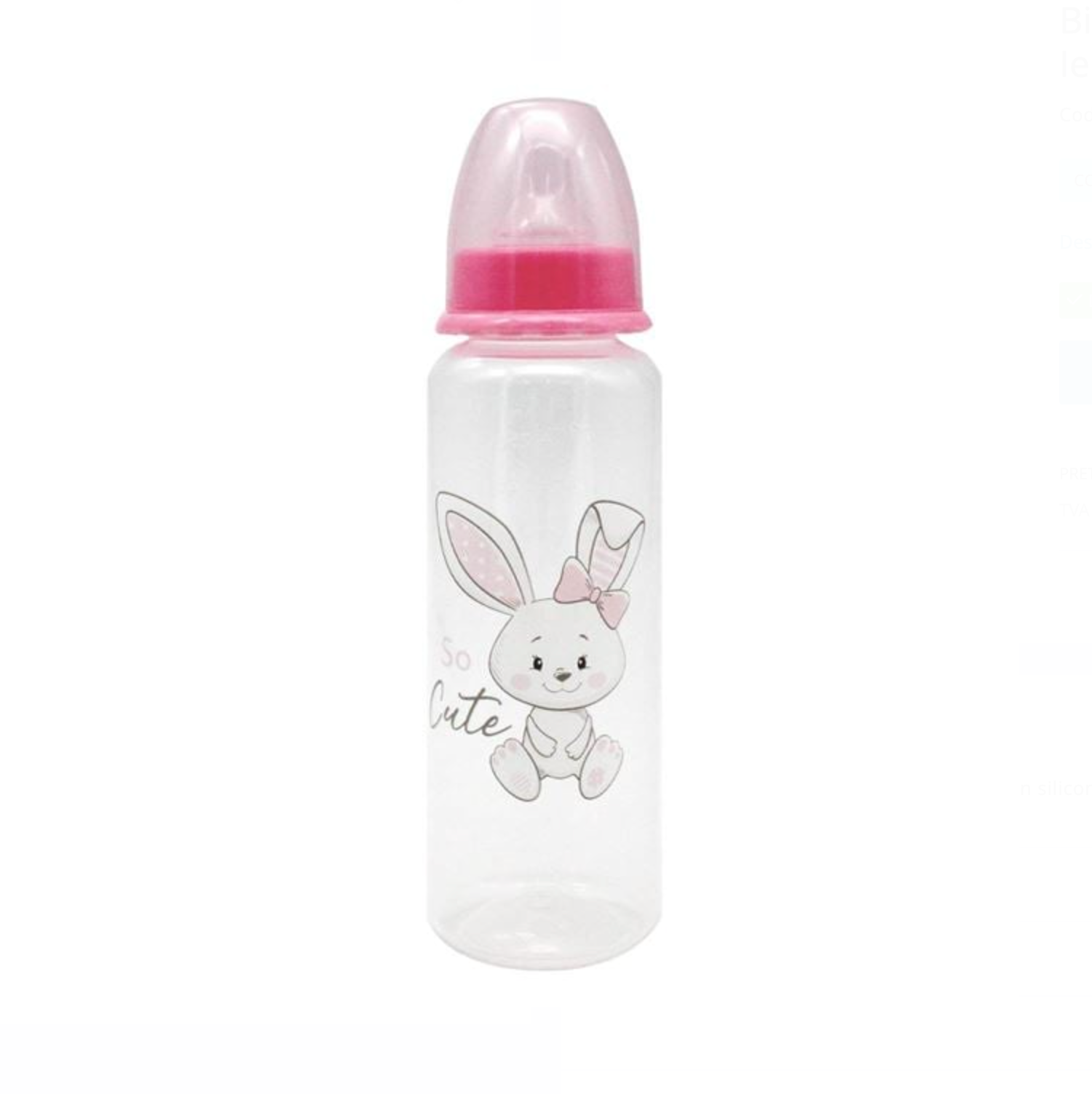 Biberon din plastic (0% BPA) cu tetină din silicon, flux mic, capacitate 250 ml, gât roz și model iepuraș cu mesaj „So Cute”. Ideal pentru hrănirea bebelușilor cu delicatețe și confort.