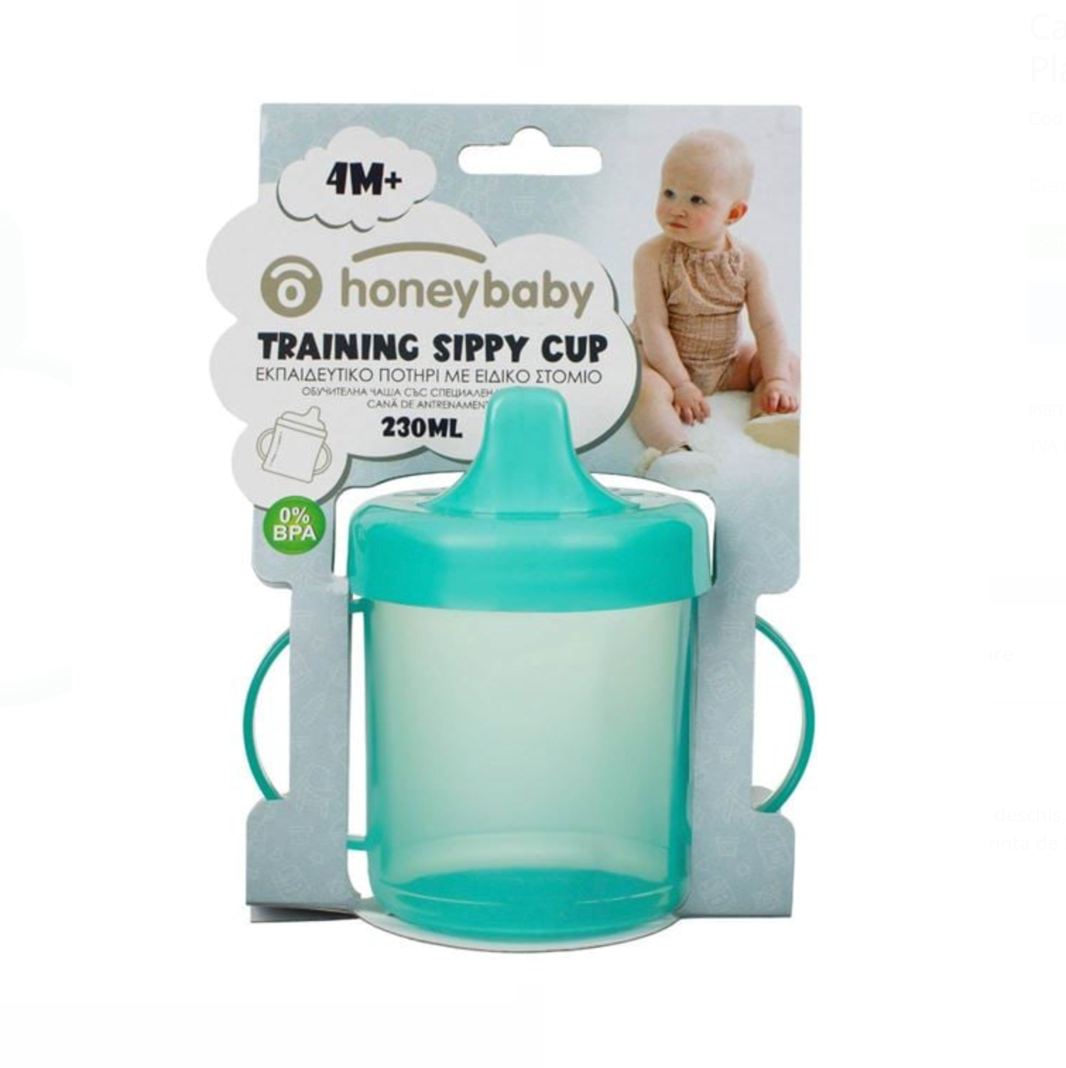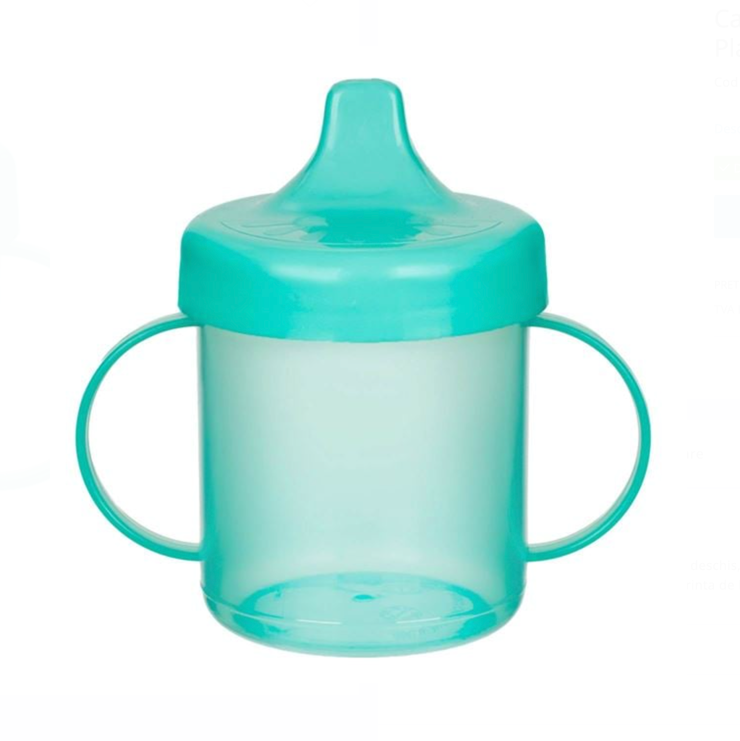 Cană de antrenament de culoare verde deschis, cu mânere ergonomice pentru o prindere ușoară și cioc din silicon moale. Fără BPA, este concepută pentru a ajuta copilul să învețe să bea singur și să facă trecerea ușoară de la biberon la cană.