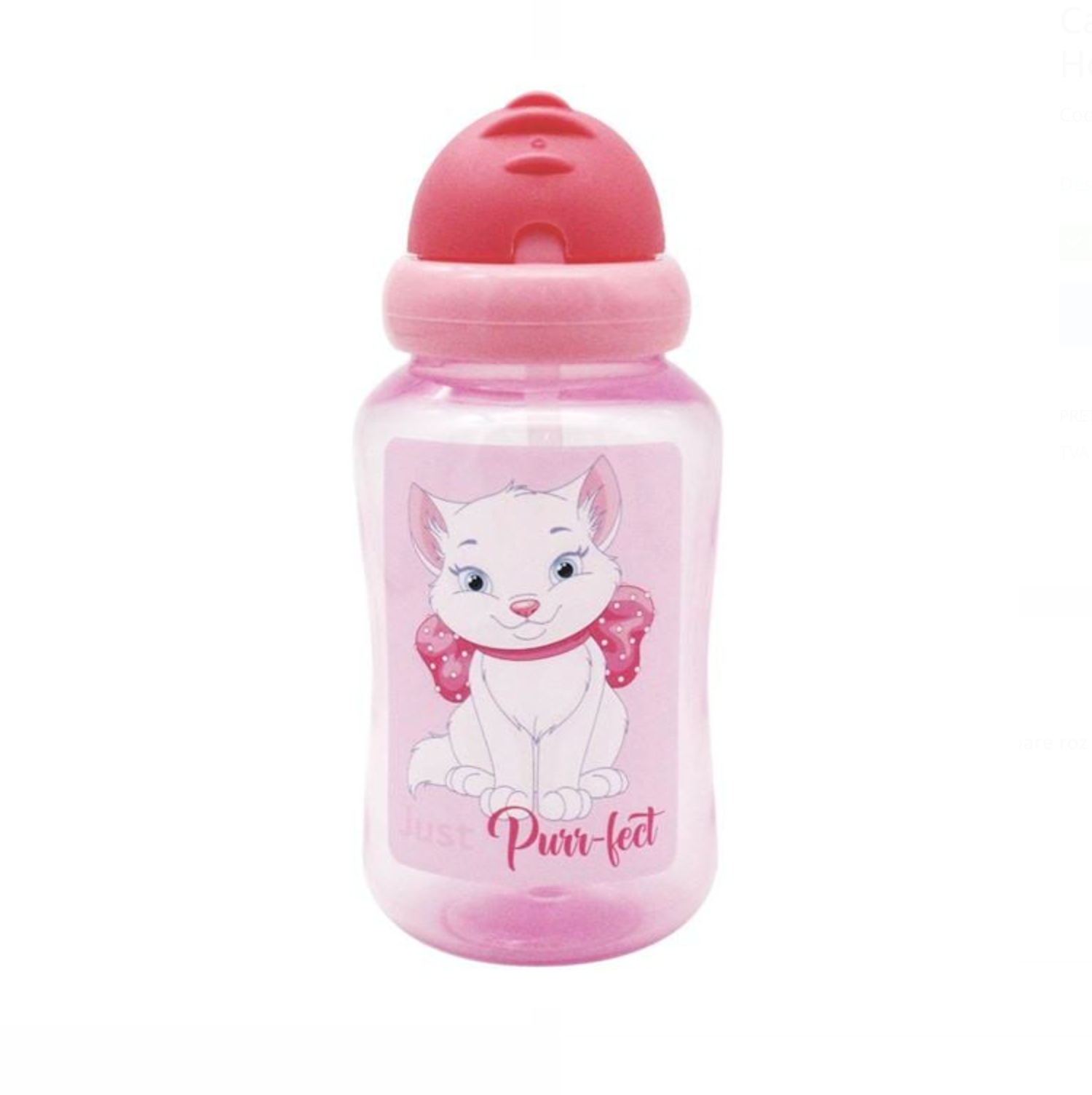 Cană pentru copii, realizată din plastic fără BPA (0% BPA), în nuanță roz, decorată cu un model drăguț de pisicuță. Potrivită pentru utilizarea zilnică, acasă sau în deplasare.