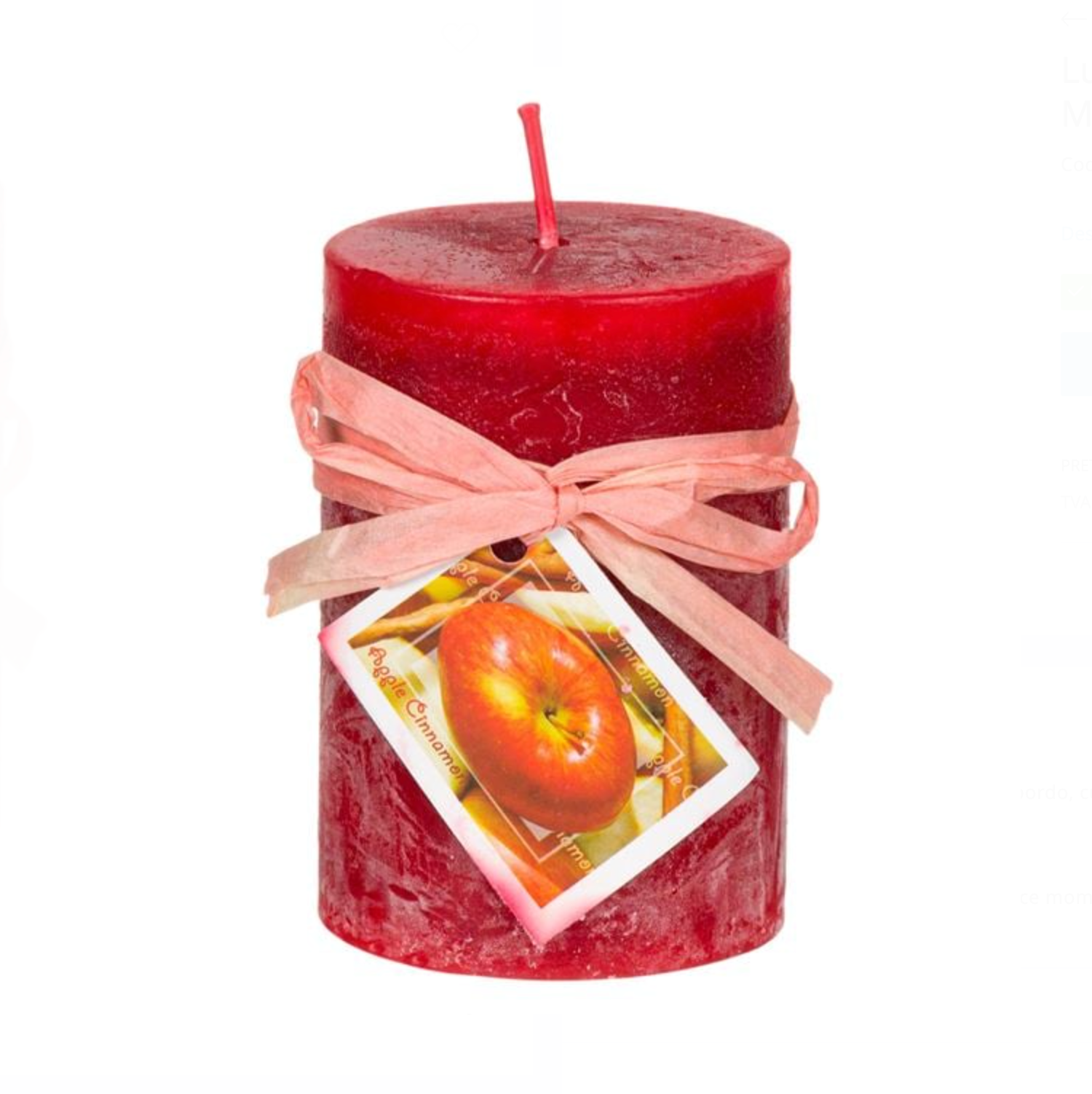 Lumânare parfumată decorativă, roșu bordo, cu aromă caldă de măr și scorțișoară, turnată într-un recipient elegant.