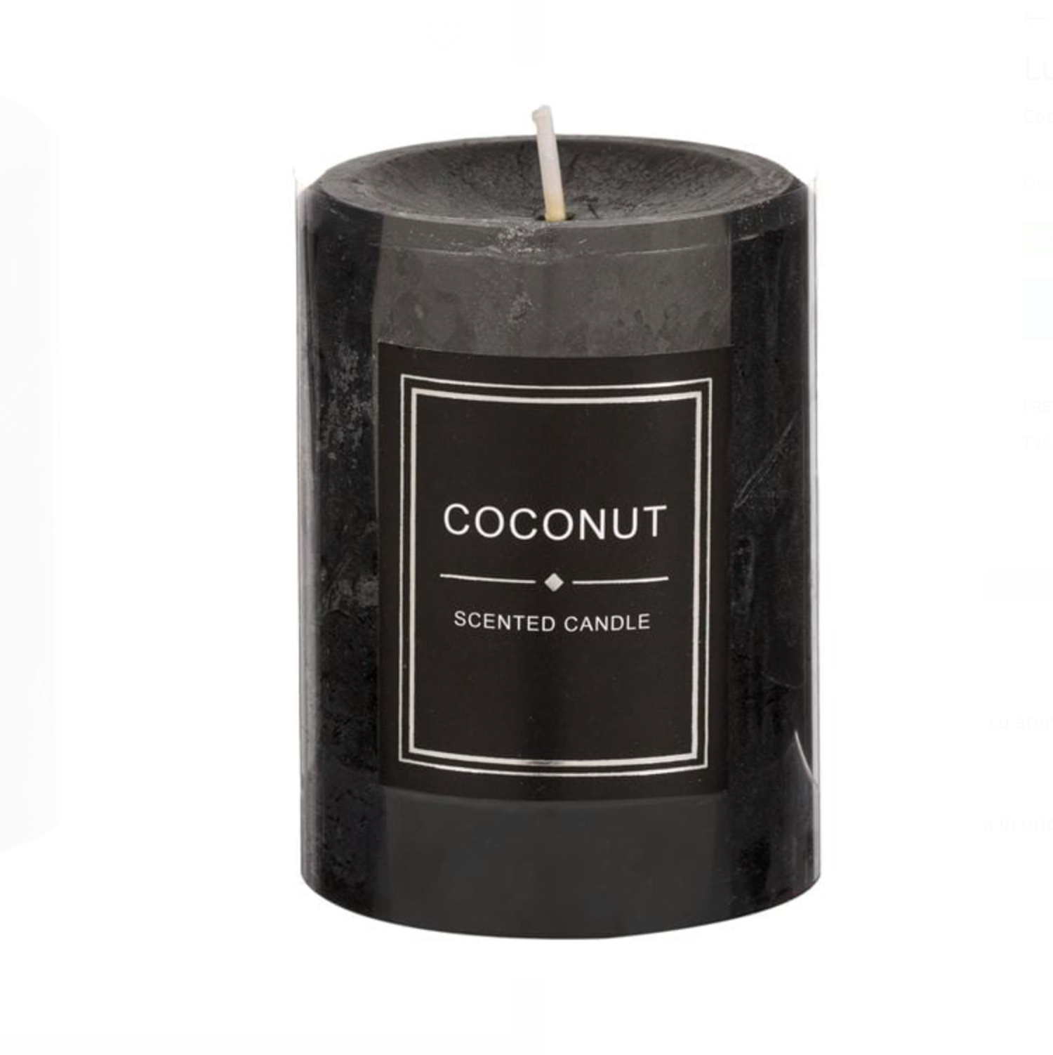 Lumânare parfumată decorativă, neagră, cu aromă delicată de nucă de cocos, turnată într-un recipient elegant.