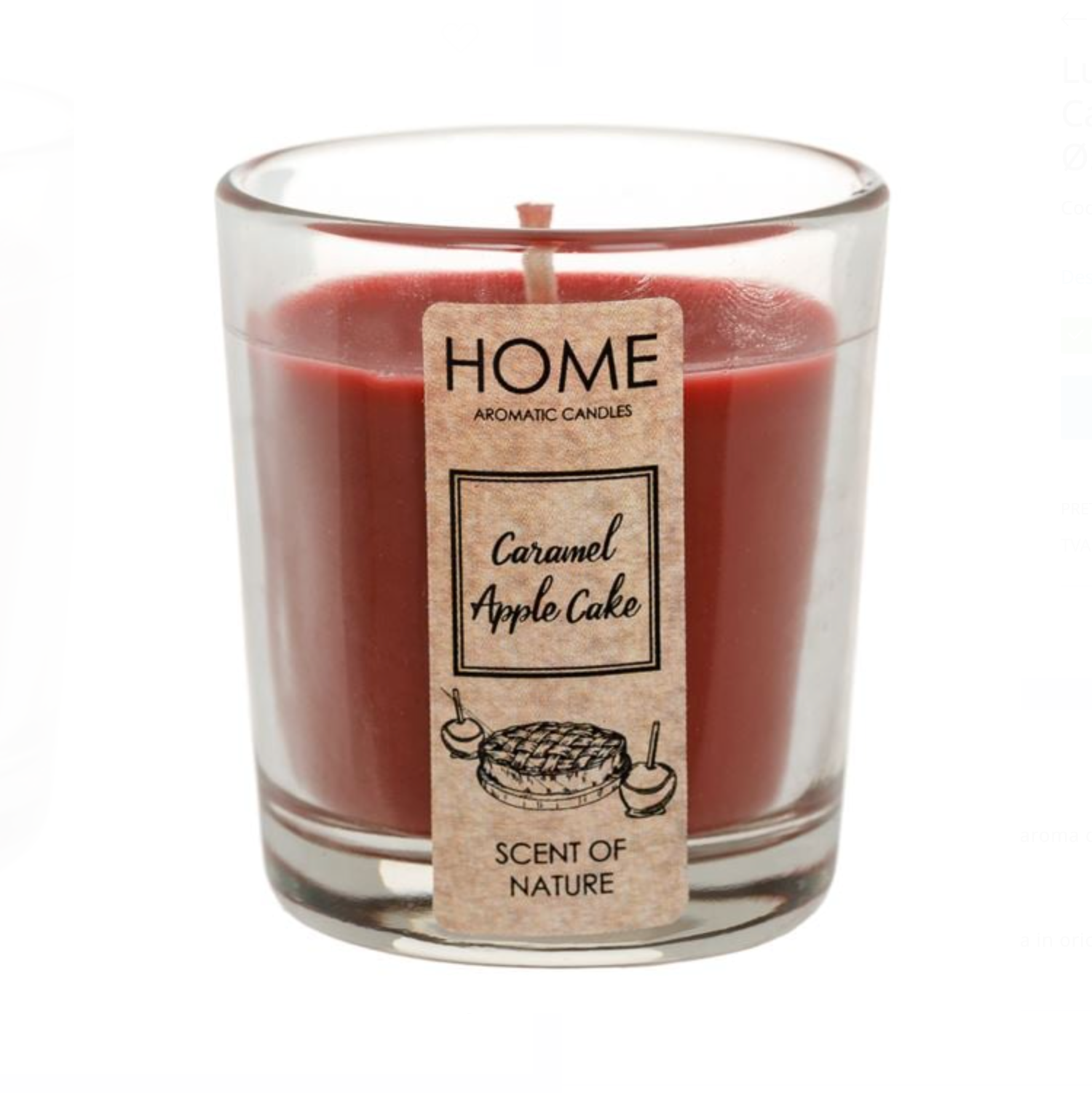 Lumânare parfumată decorativă roșie, cu aromă delicioasă de Caramel Apple Cake (chec cu mere și caramel), turnată într-un recipient elegant din sticlă, Ø5x6.5cm.